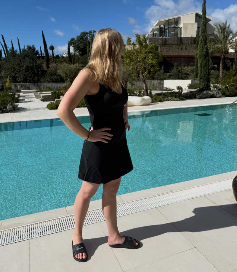 Badkjolens modell är sydd lite längre baktill för att sitta snyggt på. Den breda släta resåren ger ett stilfullt intryck sammtidigt som den har funktionen av att sitta uppe fint i midja. Modellen har en innebyxa, som fungerar som en vanlig badtrosa. Materialet känns tjockt och stadigt.